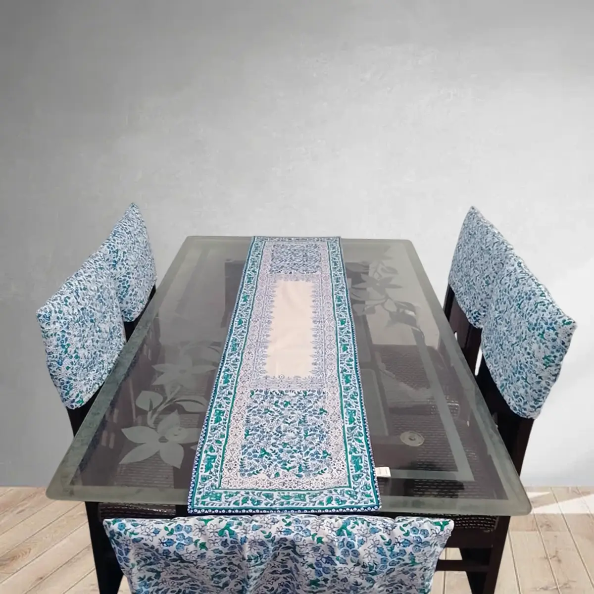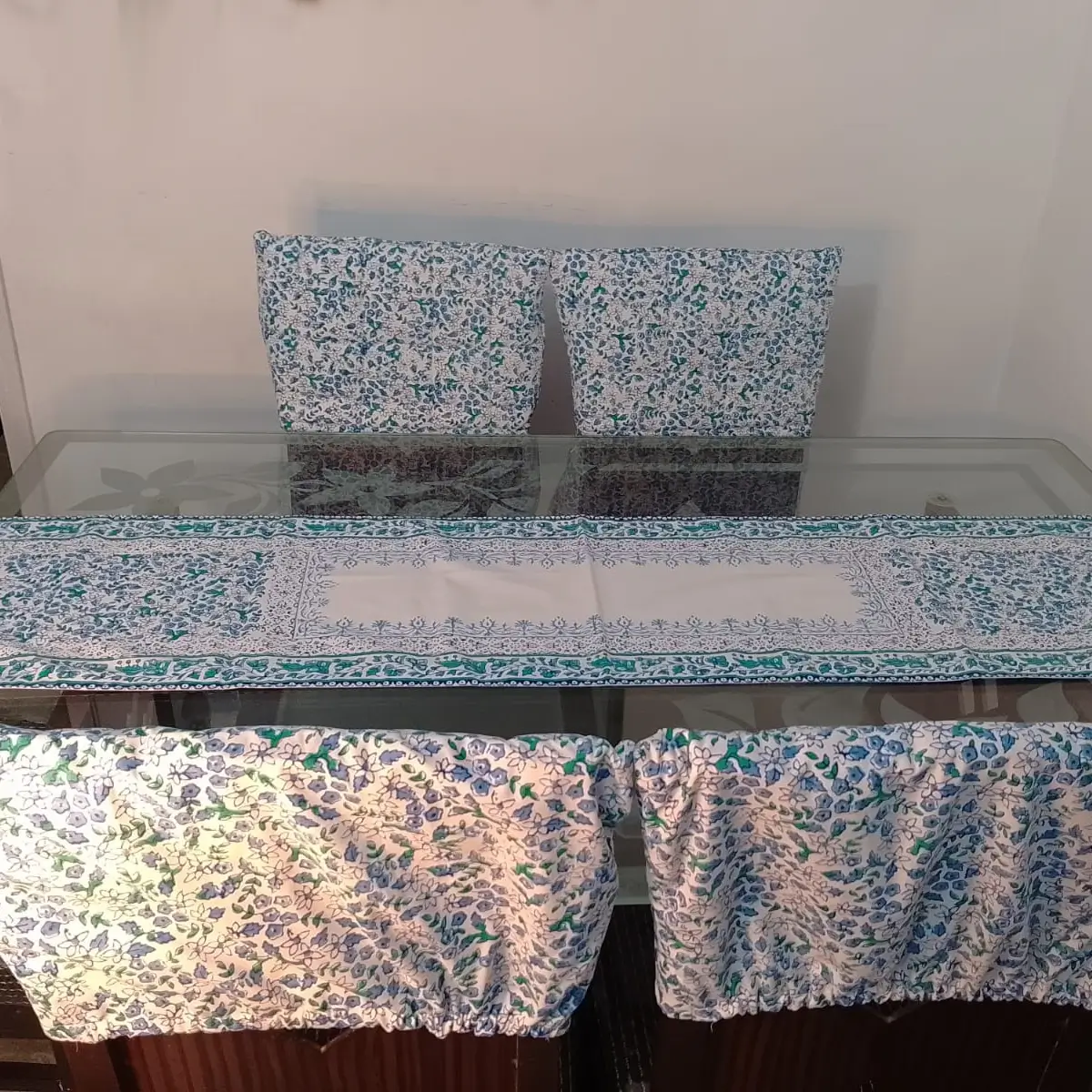 Add elegance to your dining space with Fabrics Charm’s handcrafted table runner and chair cover set – beautifully made to give your table a unique and classy look.